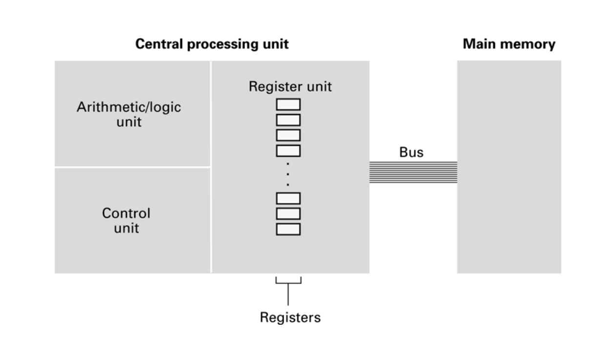 Para detallar un poco más cómo se lleva a cabo este proceso, conviene mencionar que la CPU consta de tres partes: la unidad aritmético/lógica que hace comparaciones entre datos y lleva a cabo operaciones, la unidad de control que ejecuta programas y la unidad de registros (que almacena temporalmente información). La CPU y la memoria se conectan por medio de un bus que transmite bits de ida y regreso, posibilitando la obtención de instrucciones de la memoria para ejecutar acciones.